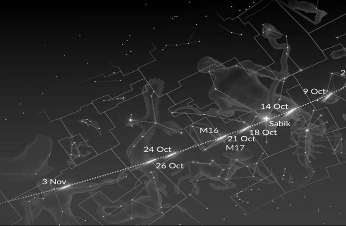 Podemos ver parte de la superficie de una Luna en su quinto día de lunación. Concretamente el terminador donde se aprecian los cráteres (de arriba hacia abajo) Aristóteles, Eudoxus y Posidonius. El resto de la superficie esta sobreexpuesta para que aparezca el planeta, que lo podemos observar en la esquina superior derecha. La separación aparente es de 25,4 minutos de grado.