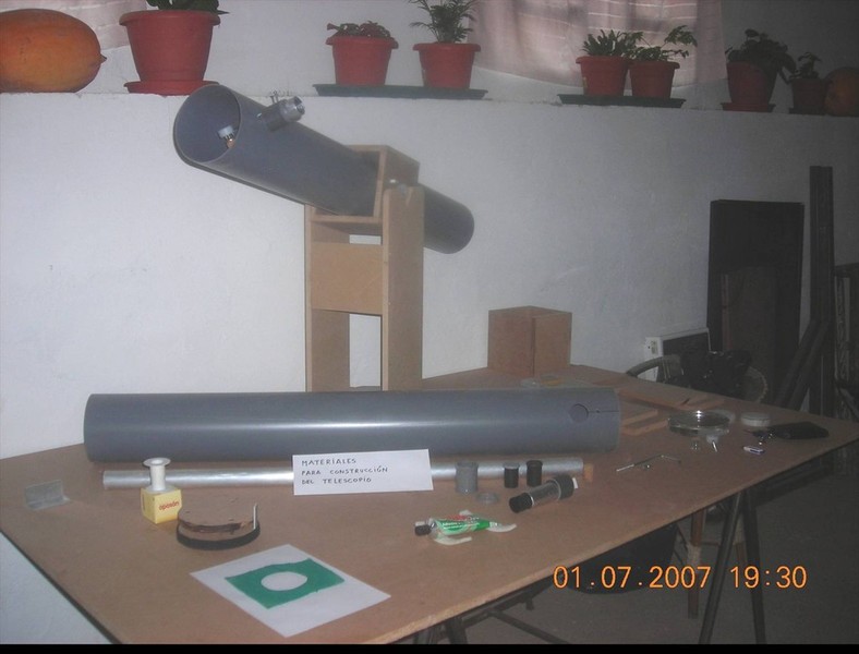 Material para construir un telescopio de 150 mm de diámetro. Tubo de PVC, Dm, tirafondos, pegamento....y mucho cariño. Fuente: CURSOS DE VERANO DE LA UNED. Los alumnos del curso "introducción a la astronomía" visitaron nuestro modesto taller.