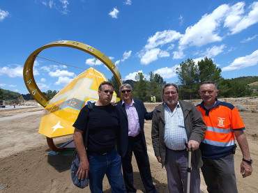 “La humanización de las carreteras”, es el fin que persigue Luis, el ingeniero de caminos jefe de la red viaria del eje del Bajo Ebro (el segundo por la izquierda). Por ello, consideró oportuno la colocación de un reloj solar en el área de descanso de XERTA (Tarragona), concretamente en la carretera que discurre paralela al mencionado río. Junto a Santiago Sese (segundo por la derecha), diseñamos este precioso reloj digital con calendario incorporado (la gran cruz en blanco). Este instrumento marca la hora solar local en lugar emblemático, cerca de los azud que derivan el agua del Ebro para regar las tierras de su delta.