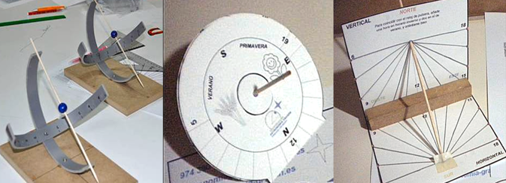 Sobre estas líneas, varios de los relojes de sol que proponemos construir en los talleres que realizamos. En estos talleres se dan cita la ingeniería y la astronomía.